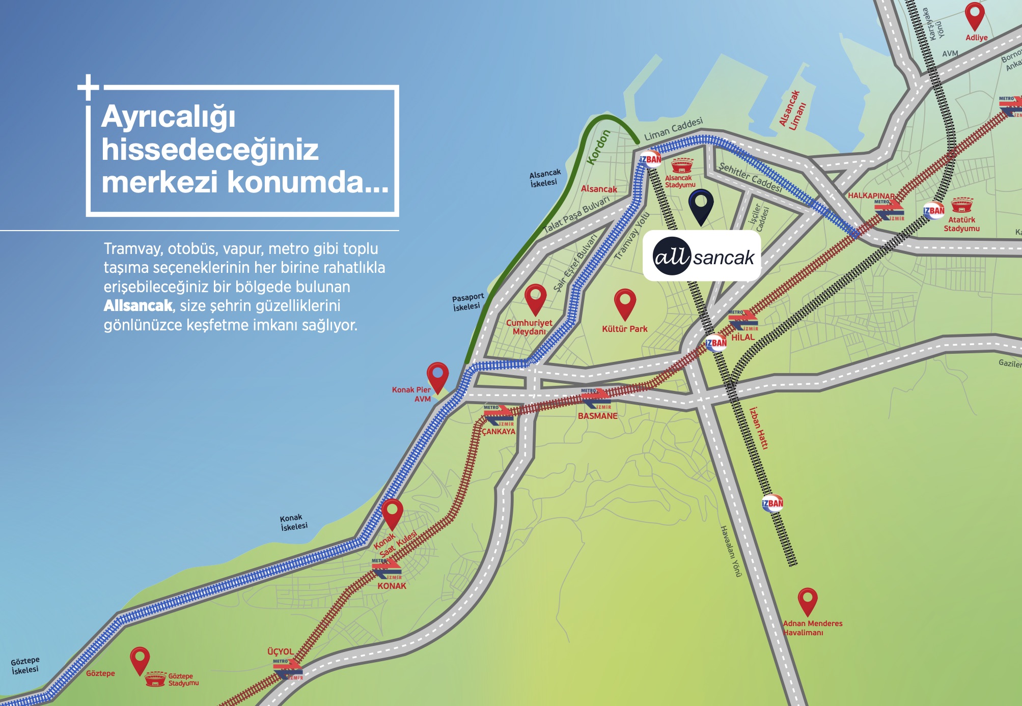 İzmir’in kalbinde yer alan Alsancak’ta, kordona, alışveriş merkezlerine, eğlence mekanlarına yakınlığı ile dikkat çeken AllSancak İzmir haftanın 7 günü, günün 24 saati İzmir’in tüm güzelliklerini hissedebileceğiniz lokasyonda. Tramvay, otobüs, vapur ve metro bir adım ötenizde, eşsiz kordon ve şehir imkanları ise en az o kadar yakın…